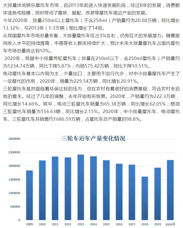 【概要描述】2020年我國(guó)摩托車產(chǎn)銷量超1700萬(wàn)輛,250ml以上產(chǎn)銷量約為20.08萬(wàn)輛,增長(zhǎng)13.32%